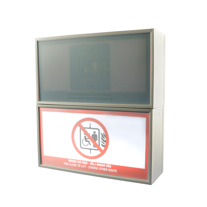 Armatur med vägledande piktogram för utrymning via hiss, inkl. grön och röd skylt. Ansluts till extern styrbox, medföljer ej.