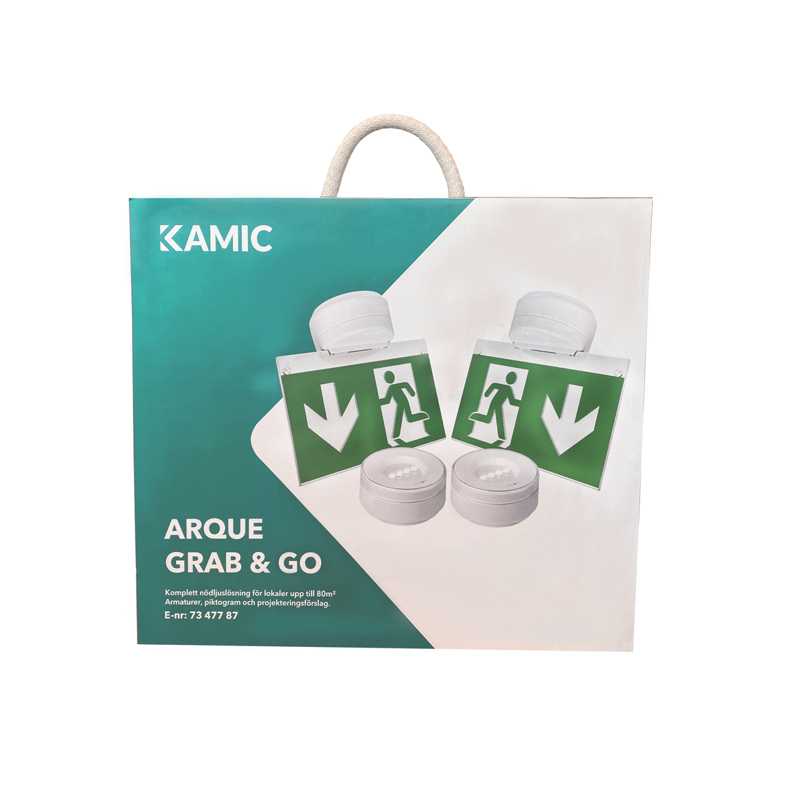 Paket och nödljuslösning som består av 4 st nödljuspuckar, två plexiskivor med fäste inkl. piktogramset samt två väggfästen. Använd t.ex två puckar som rent nödljus och två puckar, där plexiskivan och piktogram monteras som hänvisningsskylt mot utgång/ar. Ett färdigt förslag på projektering medföljer. Går enkelt, att vid behov, komplettera med fler artiklar ut Arque-serien.