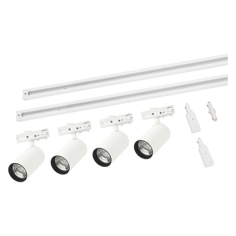 Duoline set Minirulle Warmdim vit bestående av 4 st 7W spots med 2x1 m 2-kretsskena kompl med anslutning, ändlock, skarv och täcklock. Möjlighet till individuell styrning av två faser ger stor flexibilitet på samma skena. Mycket ljus med hög färgåtergivning som vid neddimring skiftar färgtemp från 3000K till 2000K. Armaturer och skena tillv i vitlackat aluminium. Djupsittande lins ger mycket god avbländning. Optik 25°, 4x530lm vid fullt ljus. Duolinesystemet har många tillbehör att välja mellan.