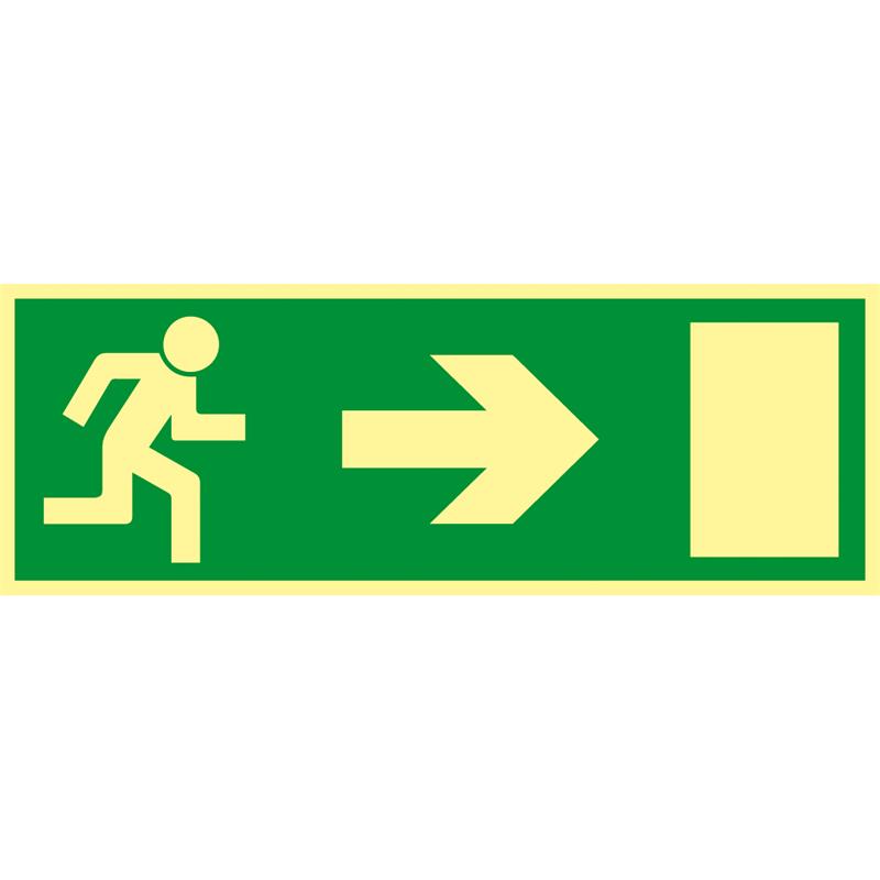 Efterlysande skylt Supernova®som visar utrymningsväg höger med symboler enligt AFS, för läsavstånd 15 m. Skylten är tillverkad av aluminium som ytbehandlats med ett patenterat ytskikt kallat Supernova®. Det speciella med ytskiktet är att skylten blir efterlysande i mörker både i skyltens varselfärg och i symbolernas avbrytande färg. Skylten laddas med hjälp av belysning eller dagsljus. Skylten efterlyser 2-8 timmar, för maximal lyseffekt tillåt 4 timmars laddning. Den uppfyller kravet i AFS 2008:13, Bilaga 2. För inomhusbruk. Monteras på vägg, med dubbelhäftande tejp eller spikar/skruvar.