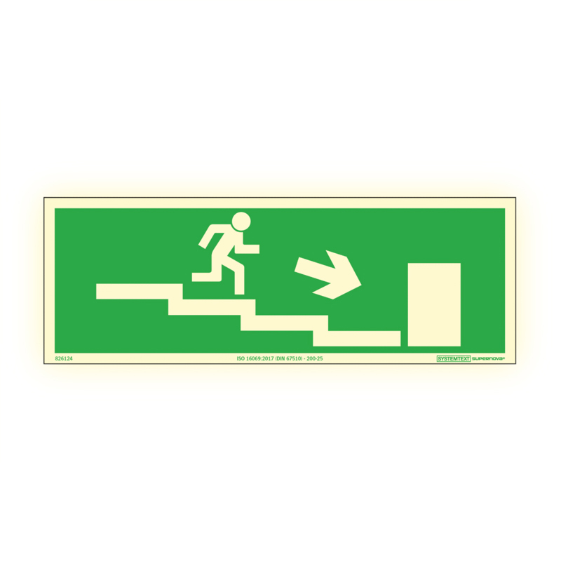 Efterlysande skylt Supernova® som visar utrymningsväg trappa ner pil höger med symboler enligt AFS, för läsavstånd 10 m. Skylten är tillverkad av aluminium som ytbehandlats med ett patenterat ytskikt kallat Supernova®. Det speciella med ytskiktet är att skylten blir efterlysande i mörker både i skyltens varselfärg och i symbolernas avbrytande färg. Skylten laddas med hjälp av belysning eller dagsljus. Skylten efterlyser 2-8 timmar, för maximal lyseffekt tillåt 4 timmars laddning. Den uppfyller kravet i AFS 2008:13, Bilaga 2. För inomhusbruk. Monteras på vägg, med dubbelhäftande tejp eller spikar/skruvar.