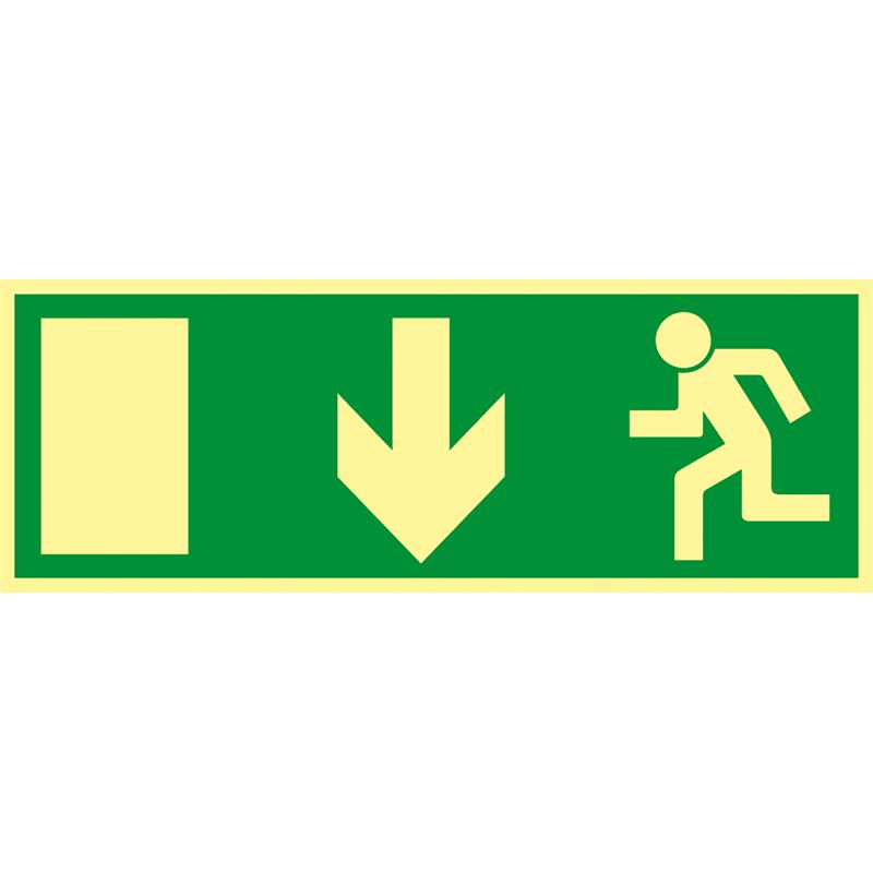 Efterlysande skylt Supernova® som visar utrymningsväg rakt fram/pil ner med symboler enligt AFS, för läsavstånd 10 m. Skylten är tillverkad av aluminium som ytbehandlats med ett patenterat ytskikt kallat Supernova®. Det speciella med ytskiktet är att skylten blir efterlysande i mörker både i skyltens varselfärg och i symbolernas avbrytande färg. Skylten laddas med hjälp av belysning eller dagsljus. Skylten efterlyser 2-8 timmar, för maximal lyseffekt tillåt 4 timmars laddning. Den uppfyller kravet i AFS 2008:13, Bilaga 2. För inomhusbruk. Monteras på vägg, med dubbelhäftande tejp eller spikar/skruvar.