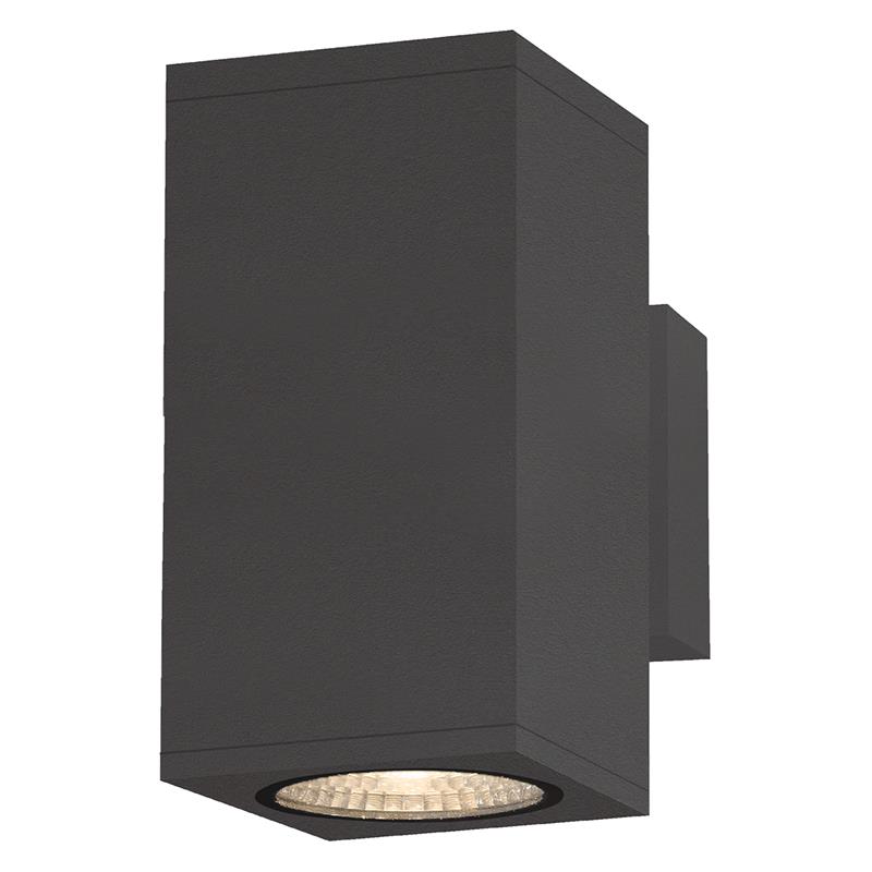 Funkis ProLED Square dubbel, antracit 2x9W, 3000K, dimbar. Ljusstark väggarmatur med kubistiskt formspråk, för hem och offentlig miljö. Med ljus både upp och ned. Djupt sittande facetterad reflektor ger mycket ljus med god avbländning. Inbyggd driver, snabbkopplingsplint och överkopplingsbar. Gjord av gjutet aluminium och försedd med klart skyddsglas. 4 st distanser medföljer, för utanpåliggande installation. 230V IP65, 55° spridningsvinkel, 1900lm. Dimringsbar.