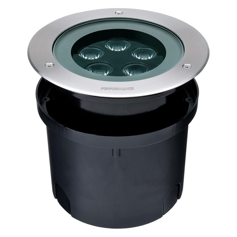 Markstrålkastare med LED vilket ger låg energiförbrukning, lång livslängd och låg yttemperatur på glaset. Serien har utförande med toppring av rostfritt stål, armaturhus av gjuten aluminium med frontglas. Levereras inklusive infällnadsbox för mark. LED enheten är riktbar +/- 15º. Smalstrålande 10grader. Ansluts till 230V, drivdon ingår. Max statisk belastning: 3000 kg. Ljusflöde: 8W 720lm, färgtemperatur 3000K