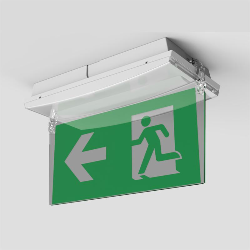 Nödbelysningsarmatur för permanent- alternativt beredskapsdrift. Piktogramset ingår för enkelsidig hänvisning pil ner resp. höger/vänster, läsavstånd 30 m samt autotest.
