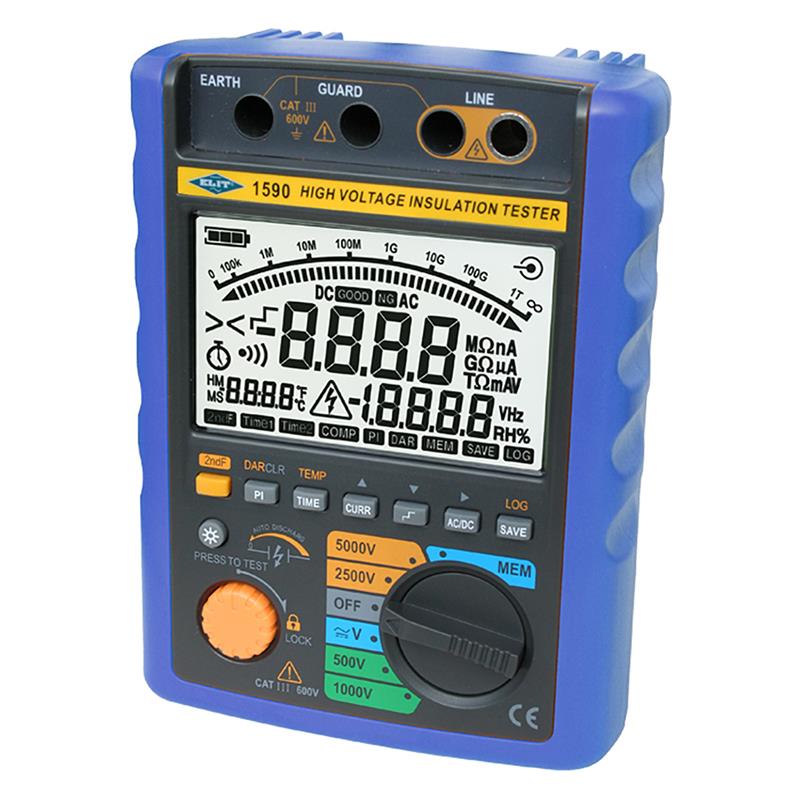 Med testspänningar från 500V till 5kV. E1590 har funktioner för diagnos (PI, DAR) med möjlighet att lagra mätresultat. Automatisk urladdning av testad krets. Steg-spänningstest, temperaturtest, läckströmsindikering. Verklig utgångsspänning och isolationsvärde visas samtidigt. Realtidsklocka för noggrann tidsstyrning. Alkaliska- eller NiMH batterier eller nätadapter. Tydlig display och Auto AV funktion. Isolerad USB port för kommunikation. Levereras med väska, testkablar, programvara, USB-kabel, nätadapter, batterier och bruksanvisning.