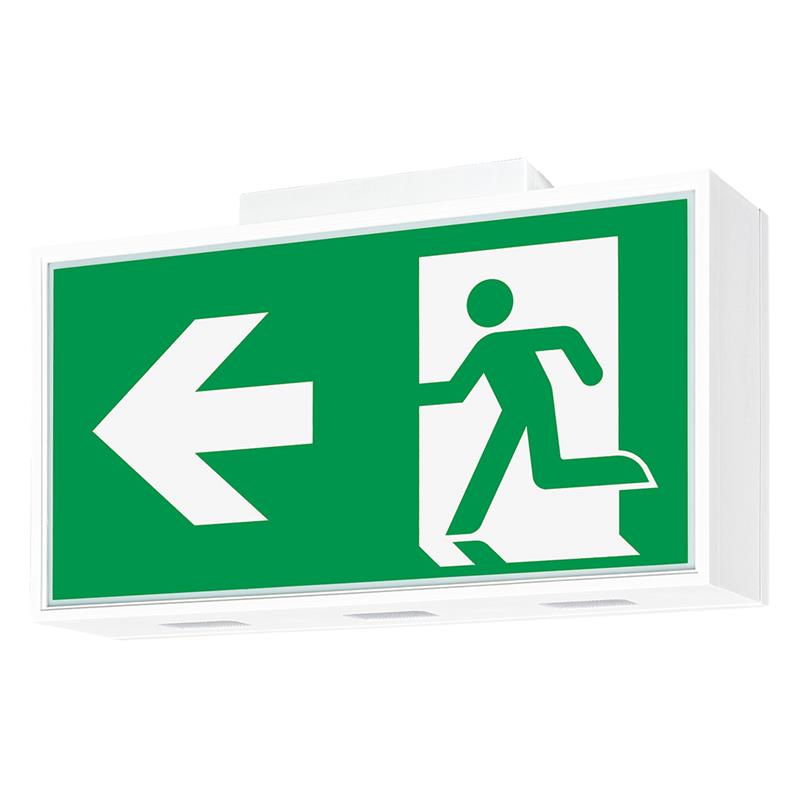 Nödbelysningsarmatur med piktogram för centralmatad permanentdrift. Läsavstånd 30 m, både enkel- och dubbelsidig hänvisning.