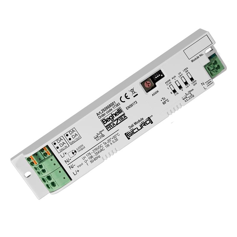 Modul för övervakning av befintlig Dali-armatur för L230 systemet. Modulen kopplas in före en befintlig armatur och tar därmed över styrning och förser armaturen med spänning i nöddrift. Modulen klarar av effekter mellan 2,5W till 500W.