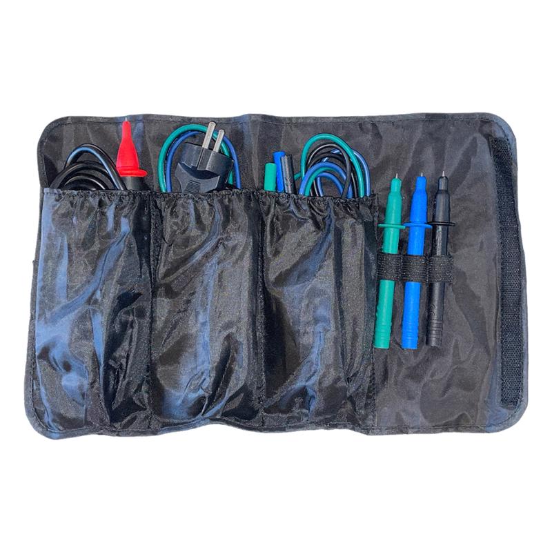 Väskan innehåller gröna, blåa och svarta mätspetsar och testkablar, vägguttagsadapter samt mätspets med testknapp och bärrem till instrumentet.