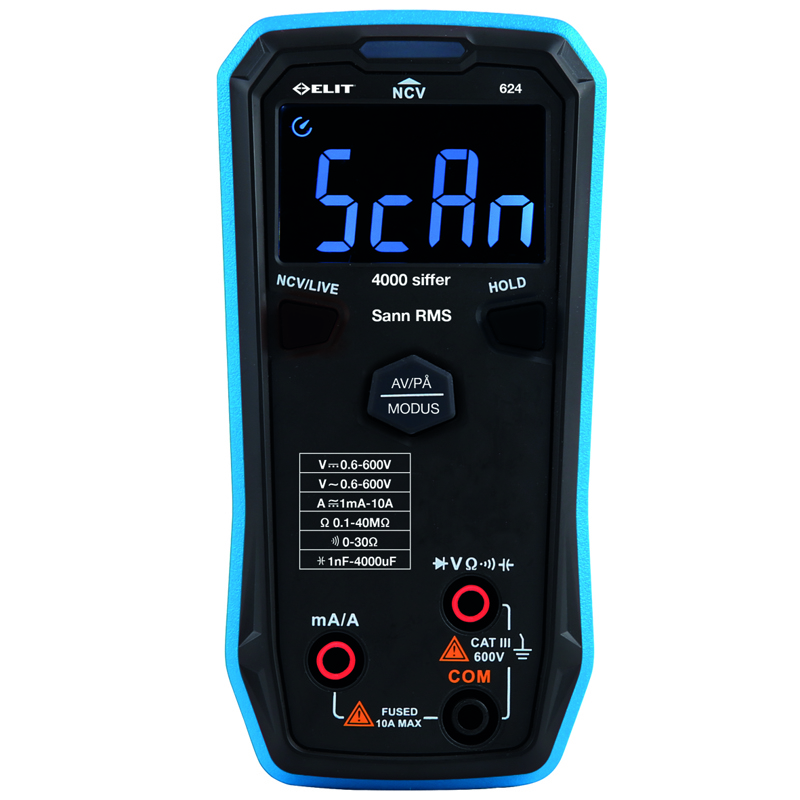 E624 är en smart minimultimeter som automatiskt väljer mätfunktion. Bara anslut till anläggningen och mät den storhet som finns att mäta. Med mätsladdarna anslutna i V & COM-terminalerna väljs automatiskt växel-, likspänning eller resistansmätning beroende på förhållandena på mätobjektet och detsamma när testsladdarna ansluts till mA/A & COM. Den skarpa, inverterade EBTN-displayen gör det enkelt att läsa av värden i dunkla miljöer utan problem. Säkerhetskategori CAT III 600V gör instrumentet användbart för både elinstallatörer, service- och fastighetstekniker.