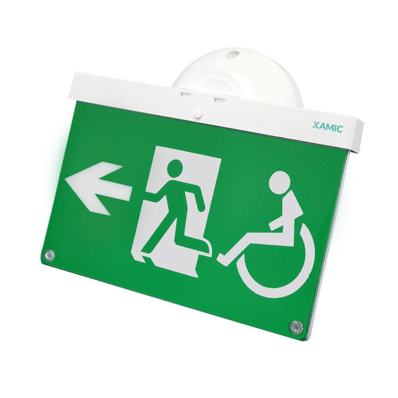 Hänvisningsskylt för Neptolux systemet. Armaturen kan monteras både på vägg, i tak, infälld och pendlad (se tillbehör). Levereras komplett med rullstolspiktogram pil vänster och höger och inbyggt NiMH-batteri.