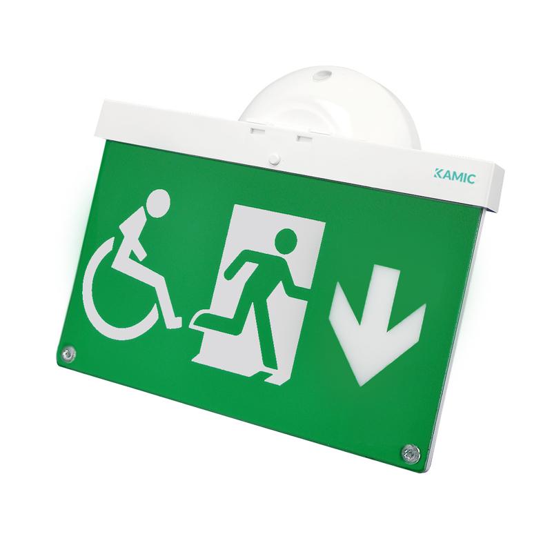 Hänvisningsskylt för Neptolux systemet. Armaturen kan monteras både på vägg, i tak, infälld och pendlad (se tillbehör). Levereras komplett med rullstolspiktogram pil ned.