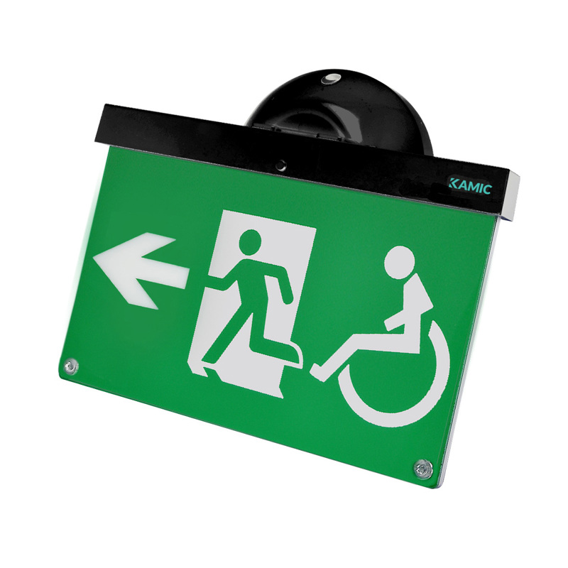Hänvisningsskylt för Neptolux systemet. Armaturen kan monteras både på vägg, i tak, infälld och pendlad (se tillbehör). Levereras komplett med rullstolspiktogram pil vänster och inbyggt NiMH-batteri.