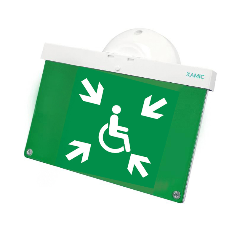Hänvisningsskylt för Neptolux systemet. Armaturen kan monteras både på vägg, i tak, infälld och pendlad (se tillbehör). Levereras komplett med piktogram för utrymningsplats och inbyggt NiMH-batteri.