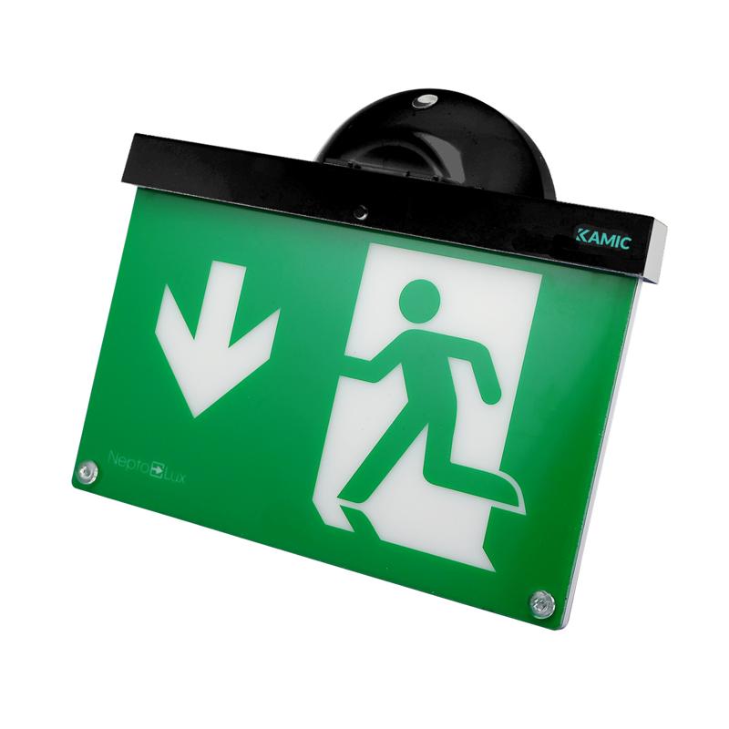 Hänvisningsskylt för Neptolux systemet. Armaturen kan monteras både på vägg, i tak, infälld och pendlad (se tillbehör). Levereras komplett med piktogram pil ned och inbyggt NiMH-batteri.