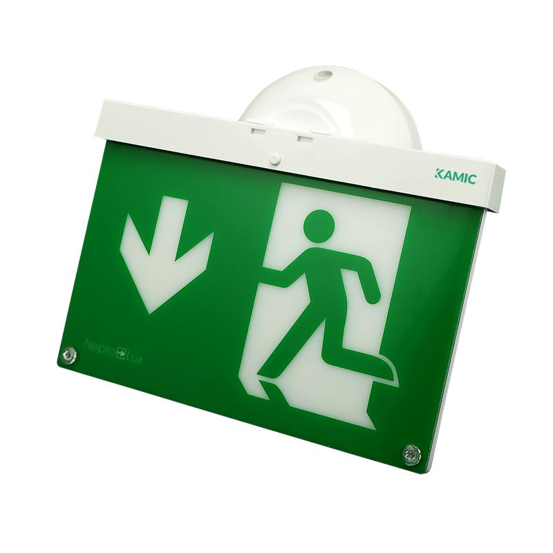 Hänvisningsskylt för Neptolux systemet. Armaturen kan monteras både på vägg, i tak, infälld och pendlad (se tillbehör). Levereras komplett med piktogram pil ned och inbyggt NiMH-batteri.
