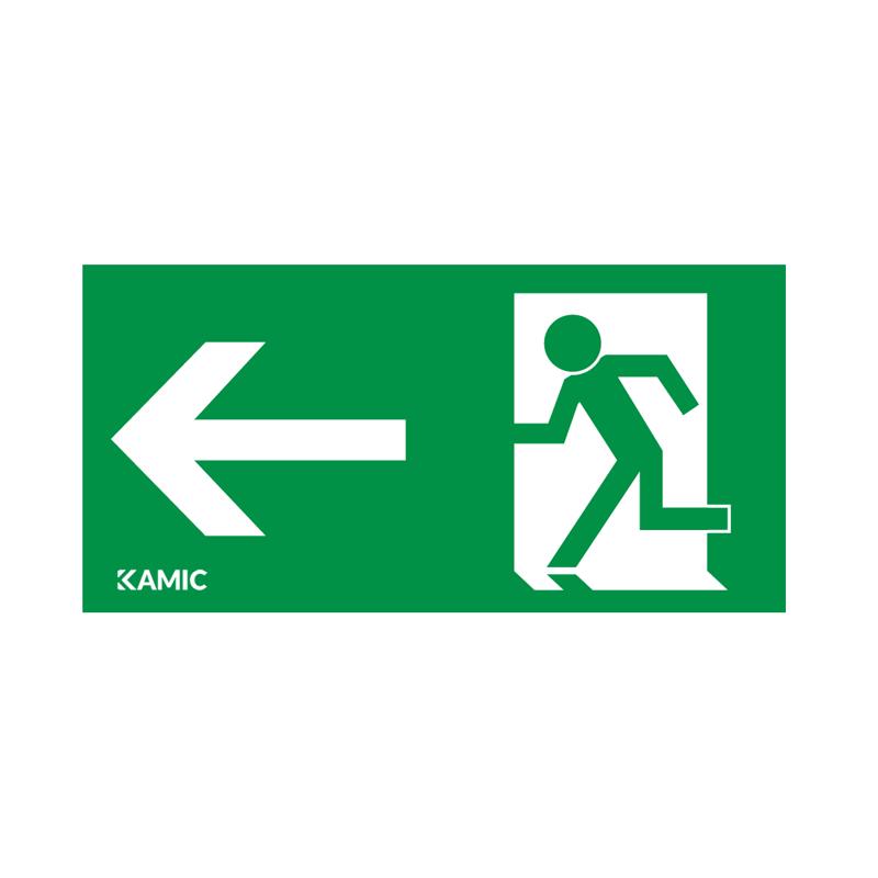 Piktogramskylt i plast med symboler för hänvisning, pil vänster. Läsavstånd 64 m. Piktogramskylten (620x324 mm) skjuts in i spåret på armaturstommen. Passar armaturstomme Profilux, E7348039 och E7348056.