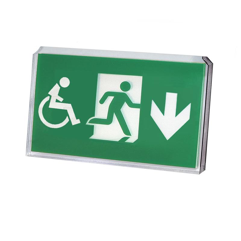 Reservdel: Dubbelsidig piktogramskylt i plast med rullstolssymbol för hänvisning pil ner/ner med läsavstånd 20 m. Piktogramskylten passar till hänvisningsarmatur Minilux modeller: E7348432, E7348442, E7348452, E7348430, E7348440 och E7348450.