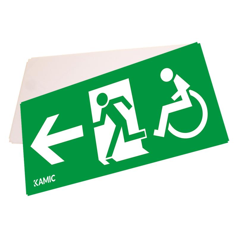 Piktogramskylt med rullstolssymbol, hänvisning pil vänster med läsavstånd 40 meter och 1 st täckskiva till armaturstommens baksida. Passar armaturstomme Profilux IP44 (E7343589).