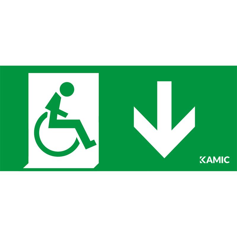 Piktogram med rullstolssymbol för hänvisning med pil ner. Läsavstånd 40 m.