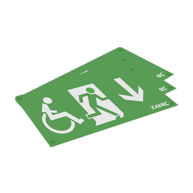 Piktogramset till enkelsidig kupa för montage på insidan. Piktogram med rullstolsymbol för hänvisning pil höger 1st och pil vänster 1st samt pil ned 1st. Läsavstånd 24 m.Till nödbelysningsarmatur Exodus (E73 434 25, E73 434 26).