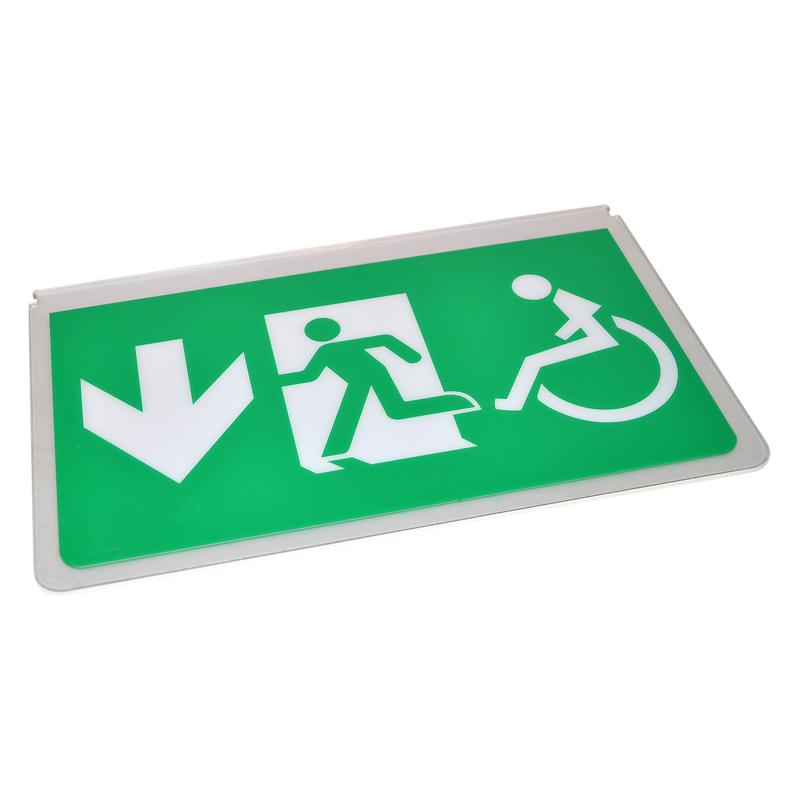 En underhängande dubbelsidig skylt med rullstolssymbol, hänvisning pil ned. Läsavstånd 30 m. Passar till en av nödbelysningsarmaturerna i Too Pac (E7345497).