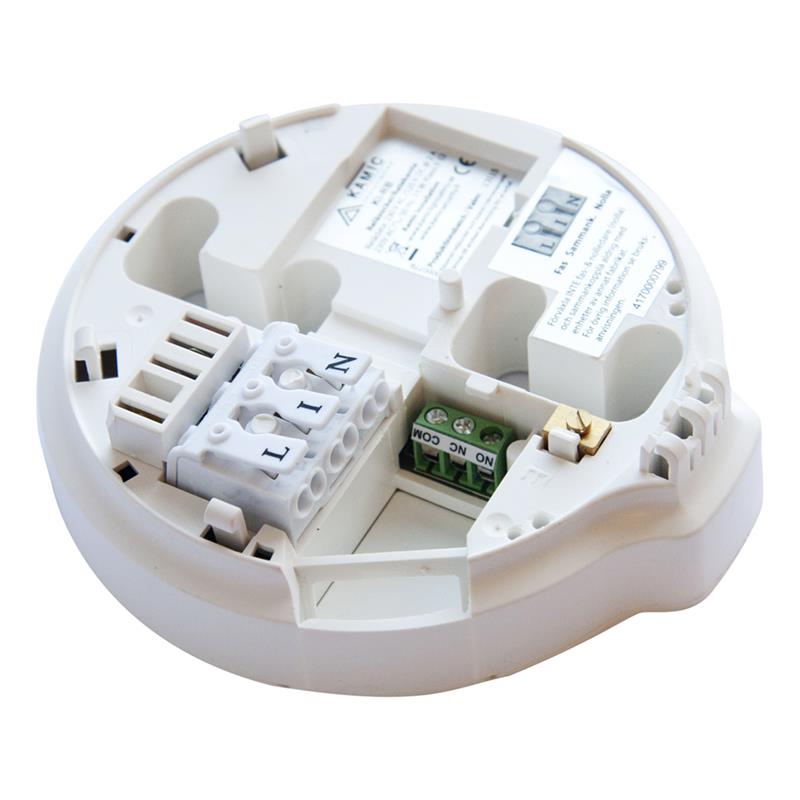 Används tillsammans med E6303417, E6303421 eller E6303422. För styrning av extern utrustning som t.ex. kontaktorer, branddörr eller externa sirener etc. Potentialfritt relä, NO/NC. Reläet kan konfigureras att slå till/från under endast 1 sekund/1 gång i minuten, för varje minut som brandvarnaren larmar. Alternativ är att konfigurera reläet att förbli slutet eller öppet tills brandvarnarnas strömförsörjning bryts vid el-centralen, läge ”Long”. Relädata: 2A vid 230VAC / 125VDC.