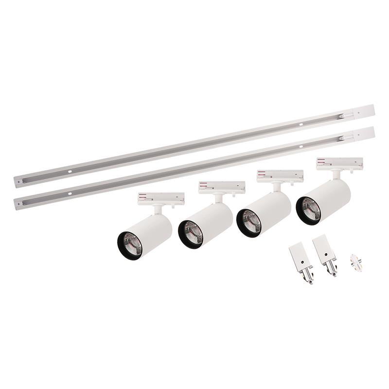 Spotline set minirulle vit bestående av 4st 7W spots med warmdimfunktion samt 2x1m skena komplett med 2st anslutningsdon, 2st ändlock, 1st skarv och 2st täcklock, som ger skenan ett stilrent intryck. Armaturerna ger mycket ljus med hög färgåtergivning, som vid neddimring skiftar färgtemperatur från 3000K till ett varmare ljus på 2000K. Armaturer och skena tillverkade i vitlackat aluminium. Djupsittande lins ger mycket god avbländning. Optik 25°, 4x530lm vid fullt ljus. Spotlinesystemet har ett stort antal tillbehör att välja mellan för att kunna skapa en optimal lösning. Armaturerna kan anpassas efter behov med olika linser, dekorativa frontringar, bländskydd och sk. barndoors. Linserna finns i 15°, 25°, 36°, 60°. Frontringar i utförande ”kort” sitter helt integrerad i fronten och gör att linsen kommer 10 mm in i armaturen, vilket ger bättre avbländning. Frontringar i utförande ”lång” gör att armaturen blir 10 mm längre, och ringens färg syns även från sidan på armaturen samtidigt som avbländningen ökar.