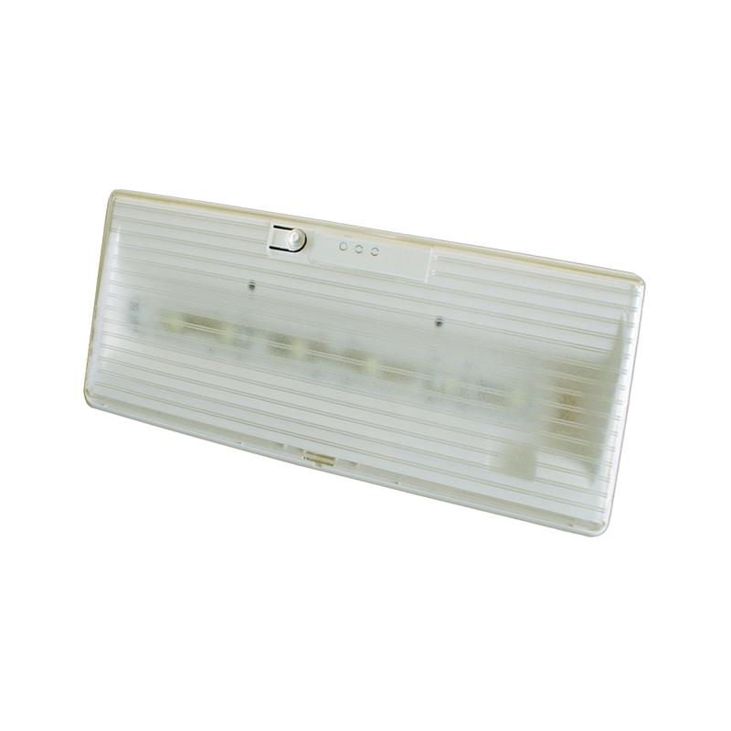 Centralmatad nödbelysningsarmatur för anslutning till reservkraftaggregat. Armatur med högt ljusutbyte, erbjuds i enkelsidigt utförande för tak eller väggmontage inomhus. Step LED har en stomme och reflektor i vit polykarbonat med en transparent kupa i polykarbonat. Kabelingångar finns på stommens kortsidor. Levereras med piktogramset, läsavstånd 20m. Anslutningsspänning: 100-250 V DC / 150-250 V AC 50/60 Hz. Nominellt ljusflöde Nät/Nätavbrott: 580 lm.