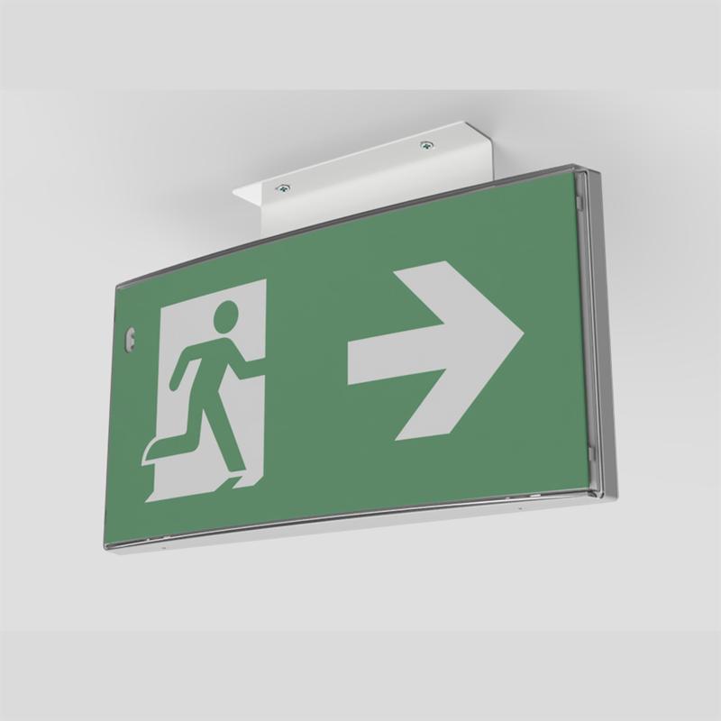 Nödbelysningsarmatur för permanent- alternativt beredskapsdrift. Piktogramset ingår för enkelsidig hänvisning pil ner resp. höger/vänster, läsavstånd 30 m samt autotest.