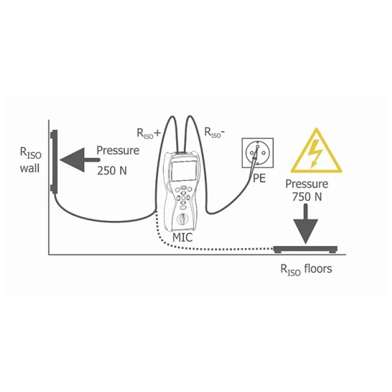Testsond med 4 mm anslutning formad som en liksidig triangel med ledande gummifötter. Tillverkad enligt EN 1081 och HD 60364-6 för mätning av golvmotstånd och väggmotstånd. Vid mätning på golv ska 75 kg tryck appliceras och 25 kg tryck vid mätning på vägg. Gränsvärdet för lägsta vägg- och golvmotstånd är 50kOhm, så isolationsprovaren bör kunna mäta så lågt som 0,050MOhm).